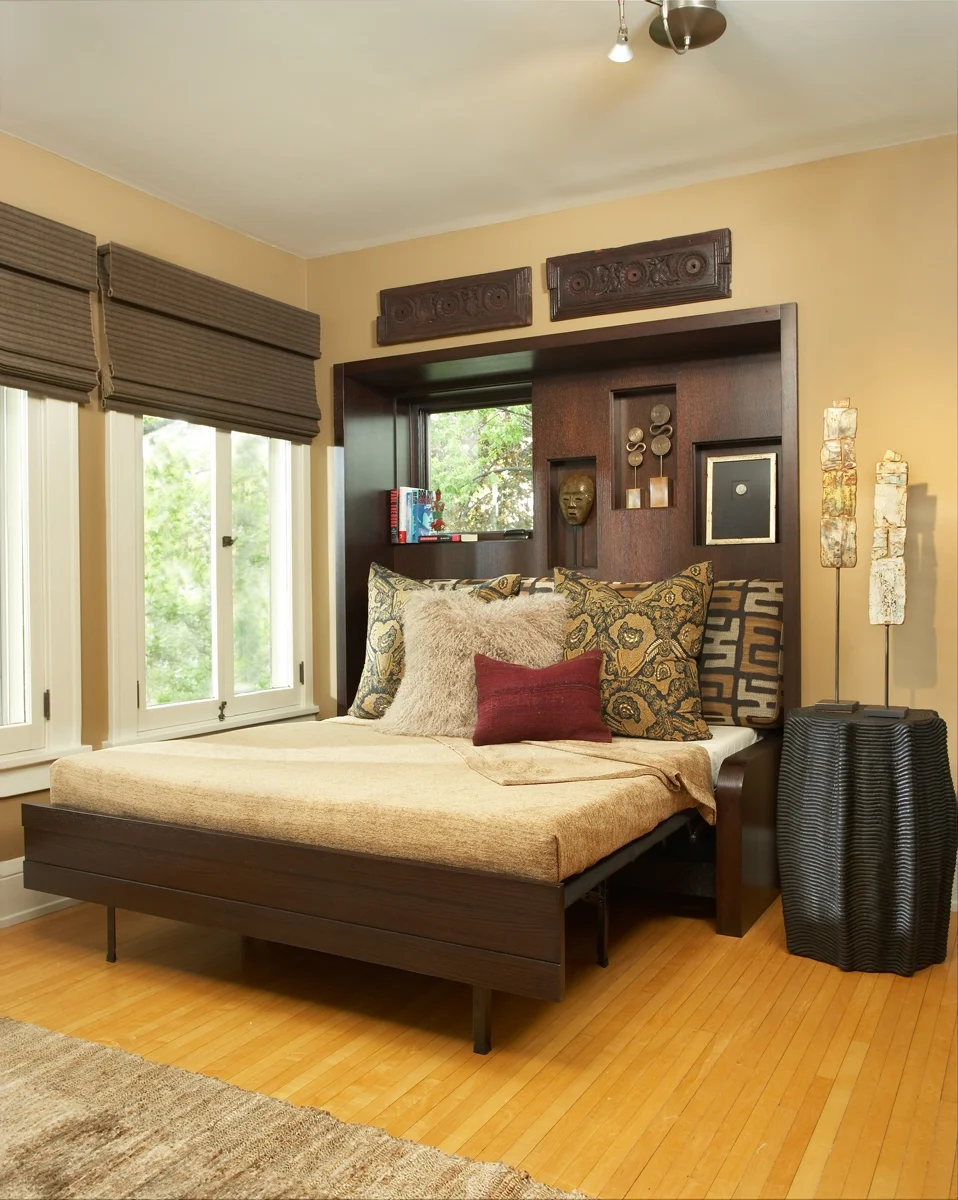 A bedroom with a bed, decorative pillows, a window with brown blinds, a framed headboard with art, and side table with sculpture lamps.